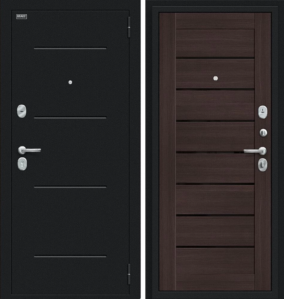 Надежная входная Дверь Браво Техно Букле черное/Wenge Veralinga премиум класса по цене 30 713 руб. Большая толщина стали защитит от проникновения в ваш дом, квартиру или коттедж. Используется очень качественная фурнитура: замки, цилиндры, ручки, защелки. Покрытие и отделка двери изготовлено под внимательным контролем производителя. Дверь имеет долгий срок службы и гарантию.